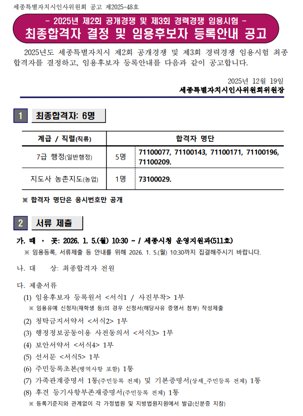 2025년 제2회 세종특별자치시 지방공무원 공개채용 최종 합격자 발표가 공고되었습니다.