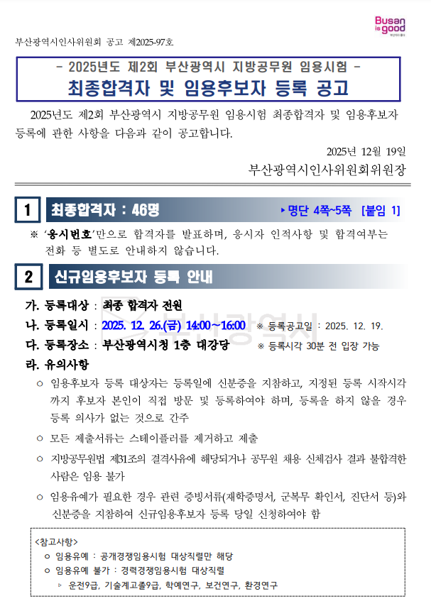 2025년 제2회 부산광역시 지방공무원 공개채용 최종 합격자 발표가 공고되었습니다.