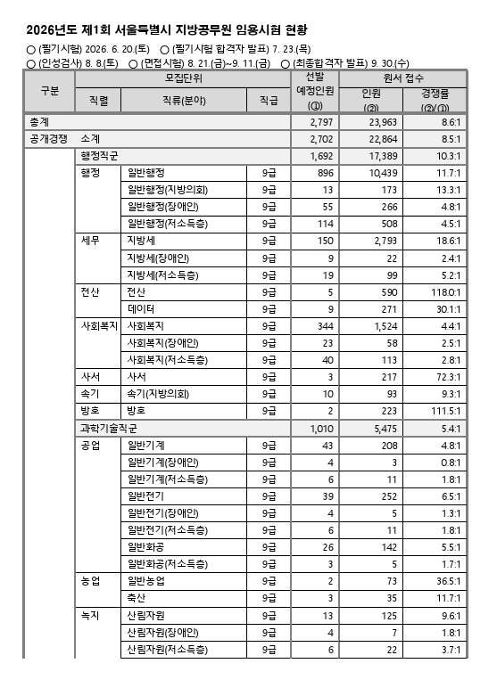 2026년 서울특별시 9급 지방공무원 원서접수 결과가 발표되었습니다.